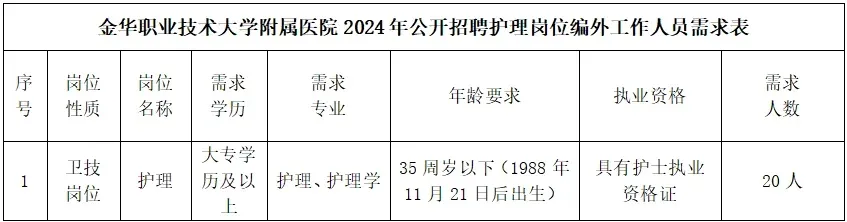 金华职业技术大学附属医院因工作需要,现面向社会公开招聘护理岗位编外工作人员20名。具体招聘事项公告如下: