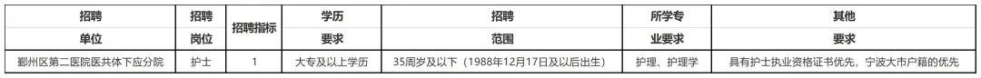 因工作需要,宁波市鄞州区第二医院医共体下应分院拟面向社会招聘编外工作人员1名。具体要求如下: