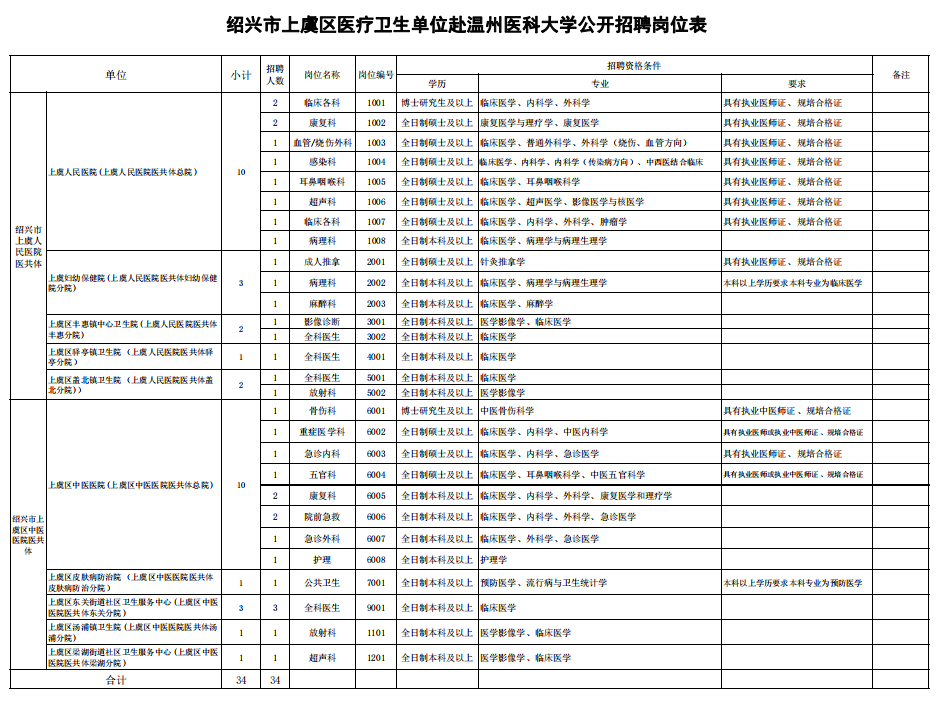 本次招聘事业单位卫技人员34名,具体招聘单位、岗位及学历条件等详见《绍兴市上虞区医疗卫生单位赴温州医科大学公开招聘岗位表》。