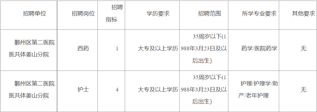 因工作需要,宁波市鄞州区第二医院医共体姜山分院拟面向社会招聘编外工作人员5名。具体要求如下: