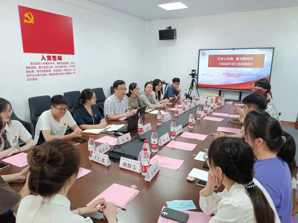 6月23日下午,我院在7A113召开2022届毕业生党员座谈会。学院党委书记陈乃车、党委副书记刘洁出席座谈会,16名毕业生党员代表参加座谈会。座谈会由学工办主任姜旭英主持。