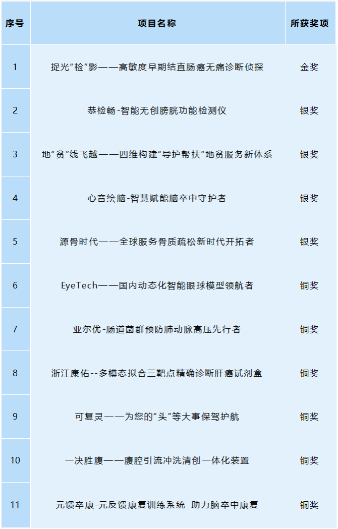 本届比赛分为科技创新和未来产业、乡村振兴和农业农村现代化、社会治理和公共服务、生态环保和可持续发展以及文化创意和区域合作五个组别,共有1936件作品进入省级复赛,69所学校的389件作品入围省级决赛。经过激烈角逐,我院“捉光“检”影—高敏度早期结直肠癌无痛诊断侦探”项目获金奖。