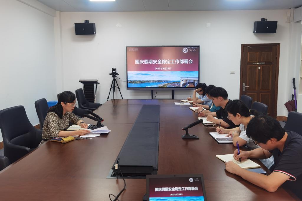 9月28日下午,学院在茶山校区7A113、滨海校区3303会议室召开国庆假期安全稳定工作部署会。会议全面落实中央、省、市以及学校对于国庆假期及前后疫情防控工作及安全稳定工作的相关部署要求,对学院疫情防控和安全稳定工作进行再研究再部署、再推动再落实。学院党委副书记刘洁主持会议,各职能部门负责人参加会议。