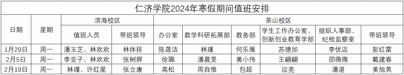 (三)寒期期间交通安排:每周一7:30从学院路校区至茶山校区,11:20返程;14:00从学院路校区至茶山校区,16:50返程。每周二至周日7:30从学院路校区至茶山校区,16:50返程。滨海校区寒假期间不安排通勤班车。医疗保障专车值班时间每天8:00-17:00,电话86699391。