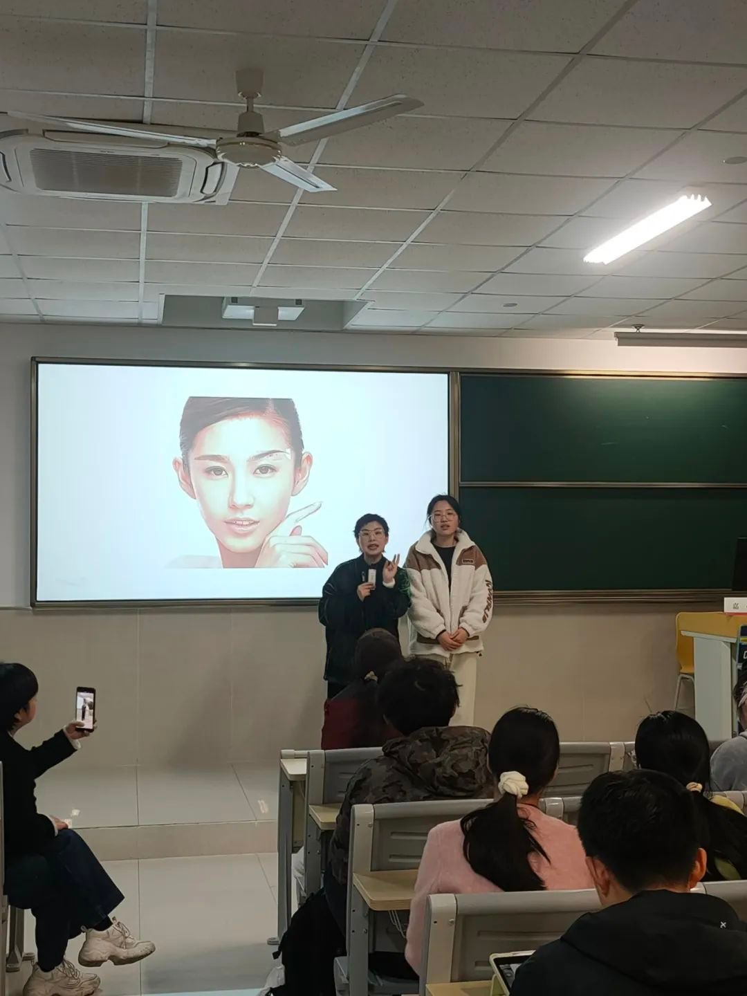 讲座分为理论讲解与实践操作两个环节。在理论环节,嘉蔓老师首先从职场形象的重要性切入,结合具体案例,详细讲解了职场妆容的基本原则与操作步骤。通过对色彩理论、肤质分析、底妆打造等专业知识的系统讲解,为学生们奠定了扎实的理论基础。