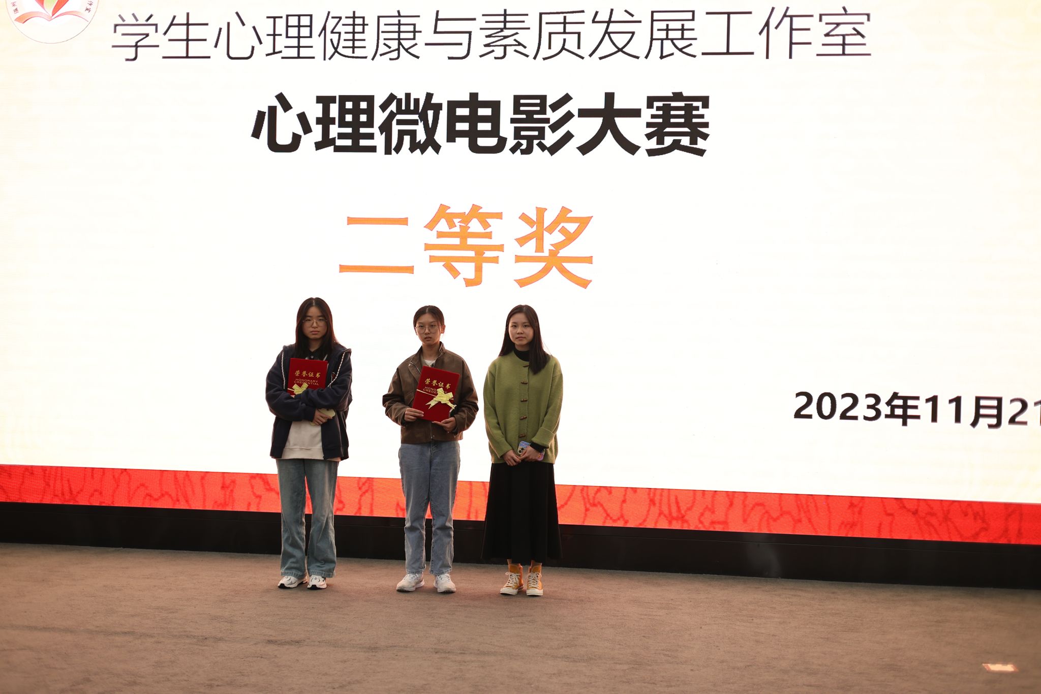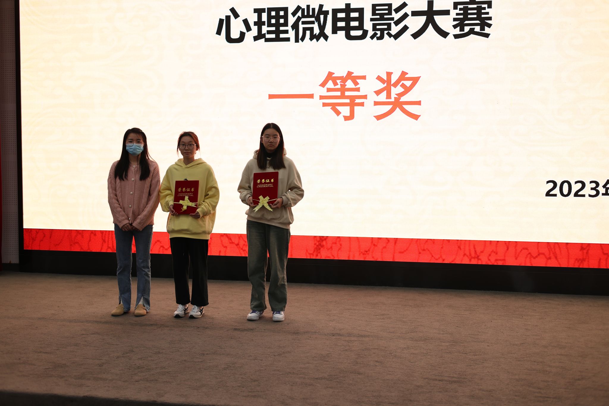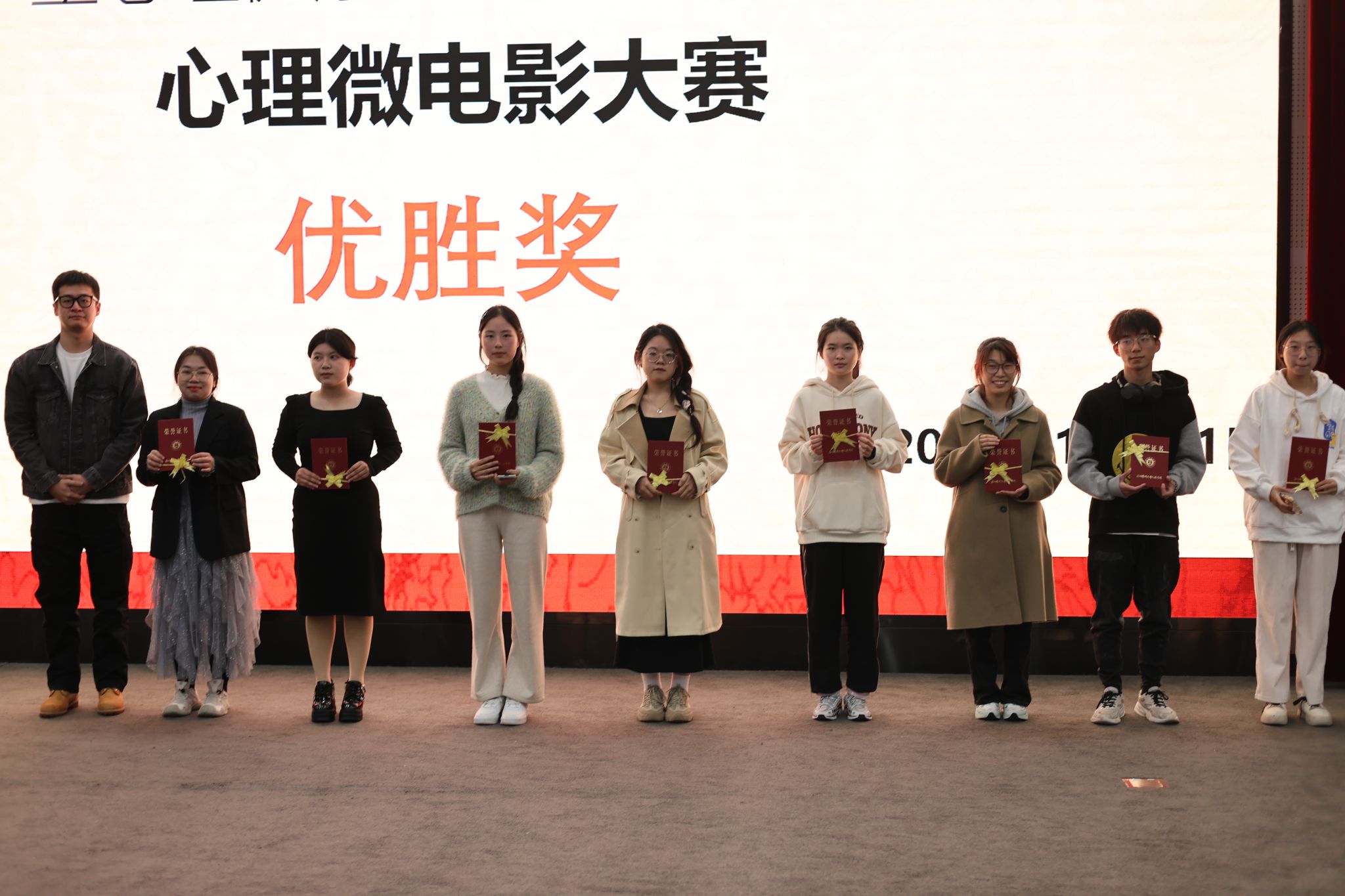 经过两个多小时紧张激烈的角逐,评委们从心理微电影的主题解说、技术效果、演员演技、剧本内容等方面进行了现场打分,《被遗忘的人》讲述了当代大学生面临的自我内耗问题,主角表演的张力融合光影的变幻让现场观众感受到心理微电影的独特魅力,荣获一等奖。本次大赛最终评选出一等奖2名、二等奖4名、三等奖11名,田丹老师、沈小冬老师及李宇老师分别上台为获奖队伍颁奖并合影留念。