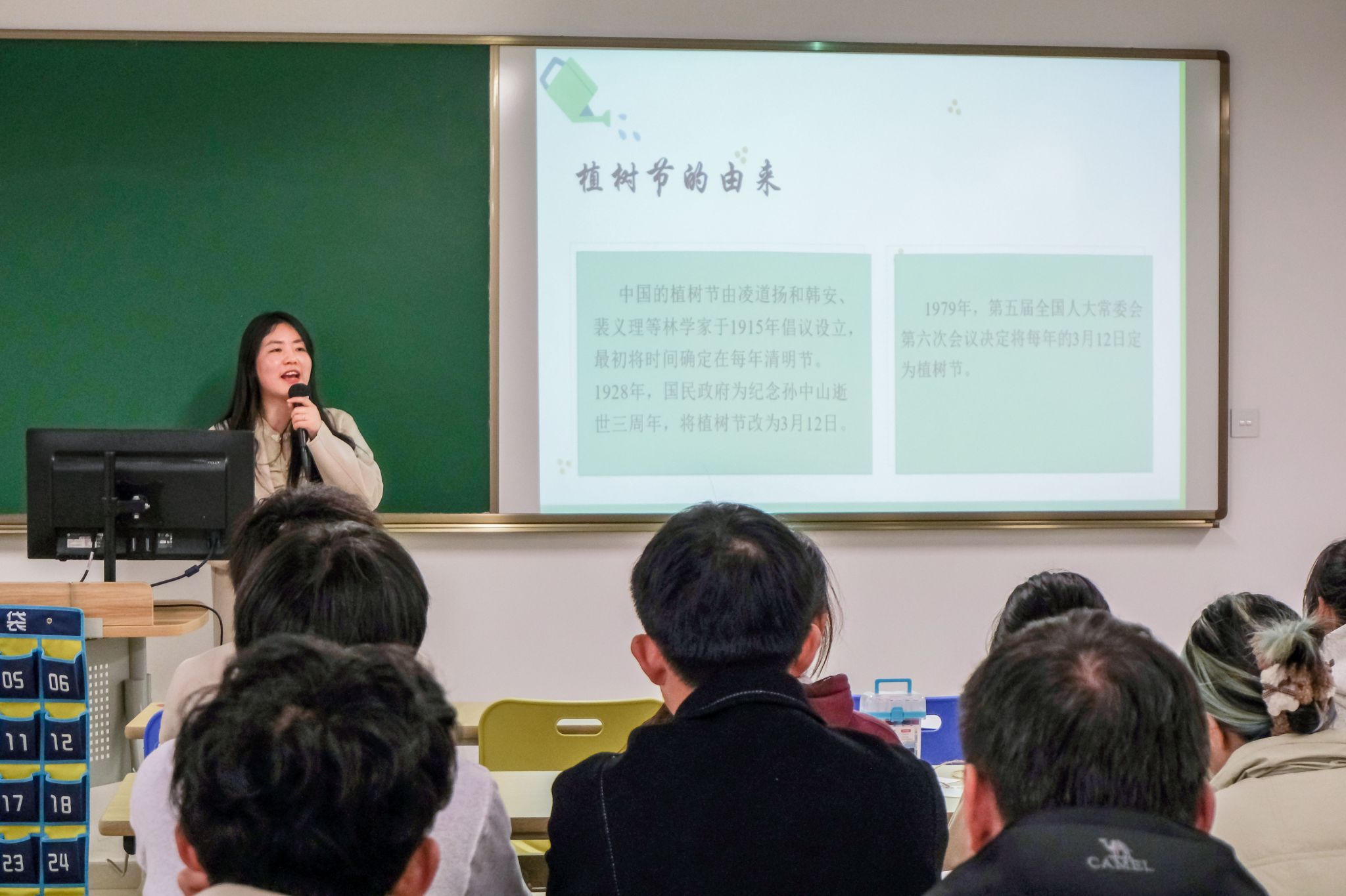 “‘天苍苍,野茫茫,风吹沙起好荒凉’,这原是一片沙地荒原,在三代塞罕坝人50多年的努力下,首都北京竖起了一道绿色屏障”,宣讲员向同学们分享了塞罕坝的故事,“112万亩林海、4.8亿棵树木,排起来可以绕地球12圈,蔚然而成绿色的海洋。”在一张张照片、一幕幕影片的直观感受下,同学们深受震撼。“塞罕坝林场建设者忠于使命,无私奉献,赢得了联合国环境署的‘地球卫士’的美誉,我们应该向他们学习,用实际行动守护来之不易的绿水青山”,现场一位同学说道。“游学+理论”的方式全方位拓宽了学生植物认知视角,在双重体验之后,同学们热情高涨,纷纷动手画出“我眼中的绿水青山”,还巧妙构思了“与树共舞”“植此青绿”等植树节创意标语。