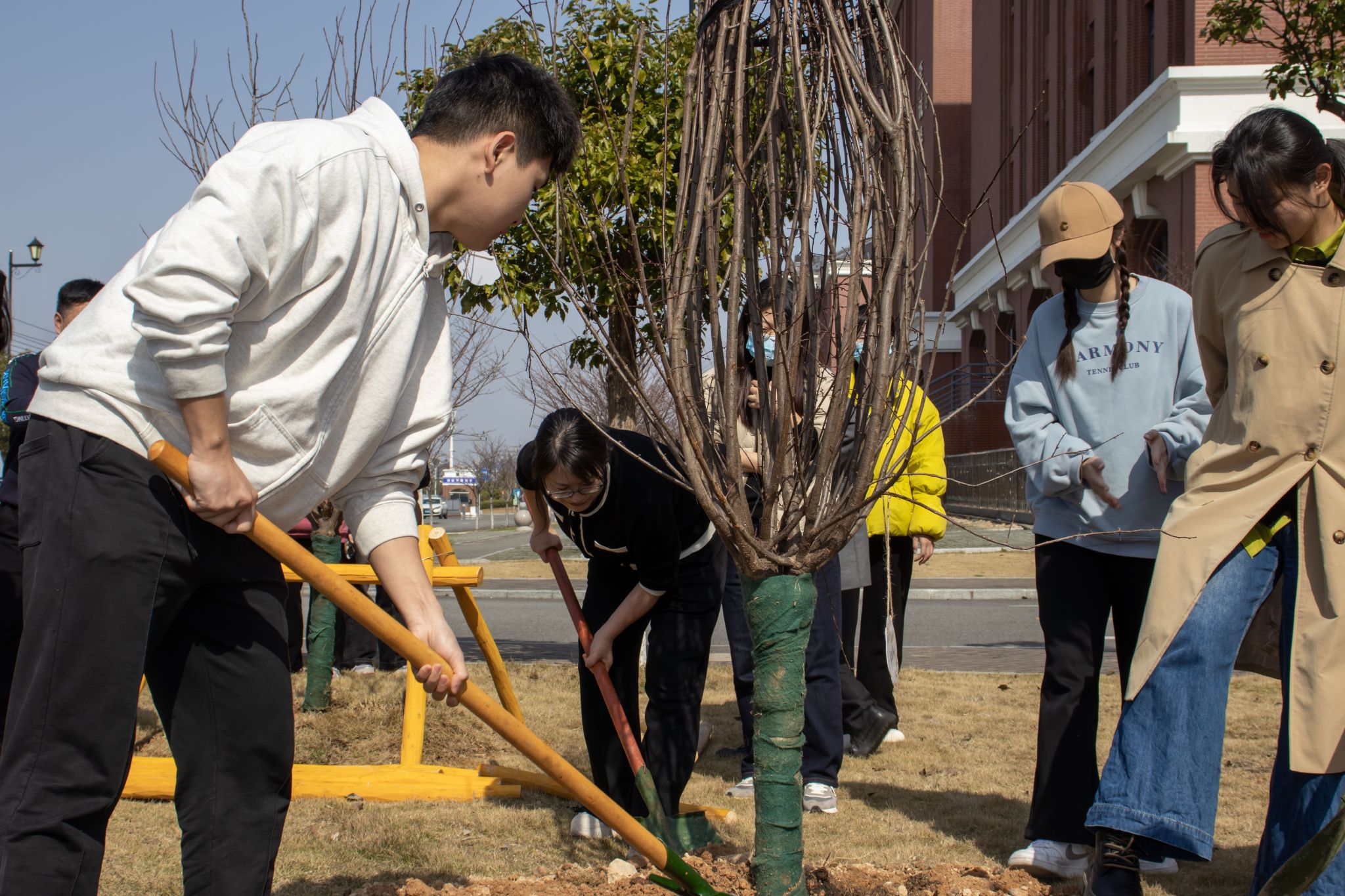 在滨海校区种植基地,一派繁忙景象。师生们精心挑选了“系树”,拿着铁锹就开始了挖地栽种,严格按照“三埋两踩一提苗”的种植要点,挥锄铲土、浇水栽种。“大家注意看这条枝杈,这个部分需要剪掉,用以降低蒸腾、减少水分的散失”,曾莹老师一边讲解一边示范,详细介绍修剪枝叶的过程及原理,同学们踊跃尝试。在同学们的精心准备下,每一棵“系树”都被“冠名”、赋予情怀,开启了一场活泼而又正式的“冠名”仪式。“我给我们的系树起的名字是‘仁·青’,‘仁’代表‘仁心济世’的院训和我们医学生的医学誓言,‘青’代表青绿、青春,像我们一样充满朝气蓬勃”,一位全科医学专业的同学开心地向大家介绍他们的“系树”。