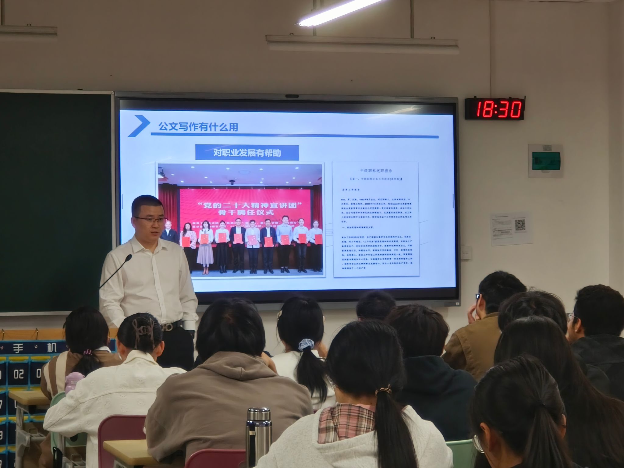 11月6日,“后浪计划——青年大学生成长赋能”之公文写作培训在我院至理楼2102如期开展。本次讲座由温州市政协特邀信息员、清华大学出版社签约作者王振老师担任主讲老师,围绕公文写作的实用性、认识深度、速成技巧及日常练习方法进行了全面而深入的探讨。