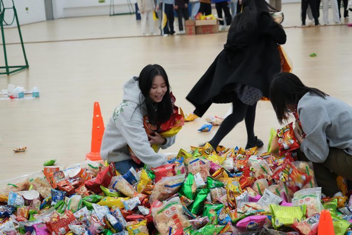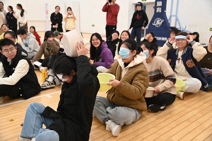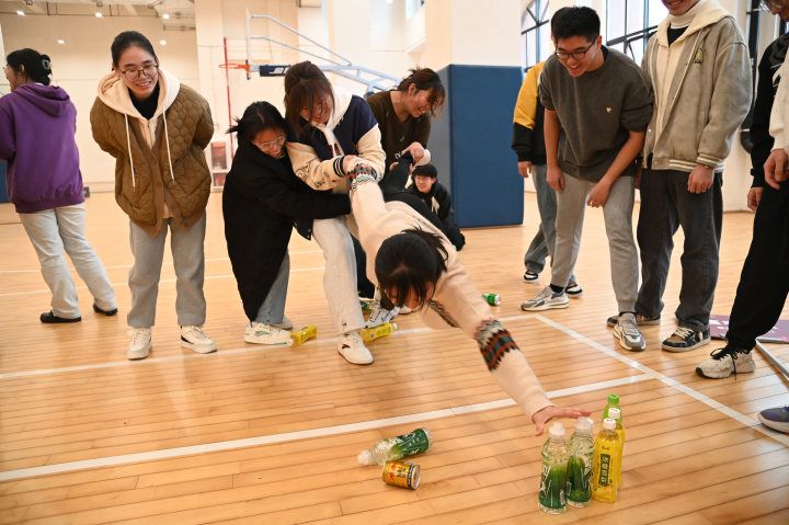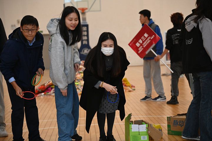 活动现场,体育馆内堆满了各式各样的零食,吸引了众多学生的目光。个人套圈比赛和拆盲盒环节更是将现场气氛推向高潮。学生们各显神通,彩圈飞舞,精准地套中一瓶瓶饮料,辅导员们也被这欢乐的氛围所吸引,纷纷加入套圈的队伍,与学生们一同享受这份难得的轻松与快乐。周围的学生则为自己的辅导员呐喊助威,欢声笑语不断,笑容在每一个人的脸上绽放。