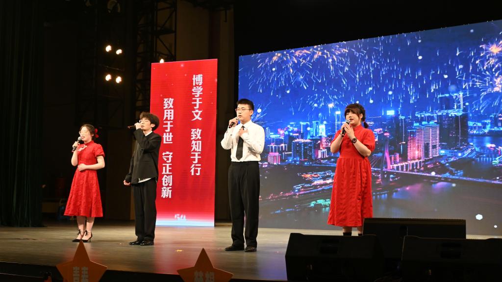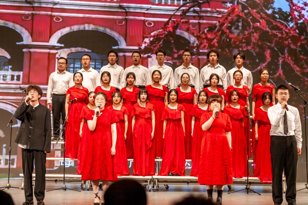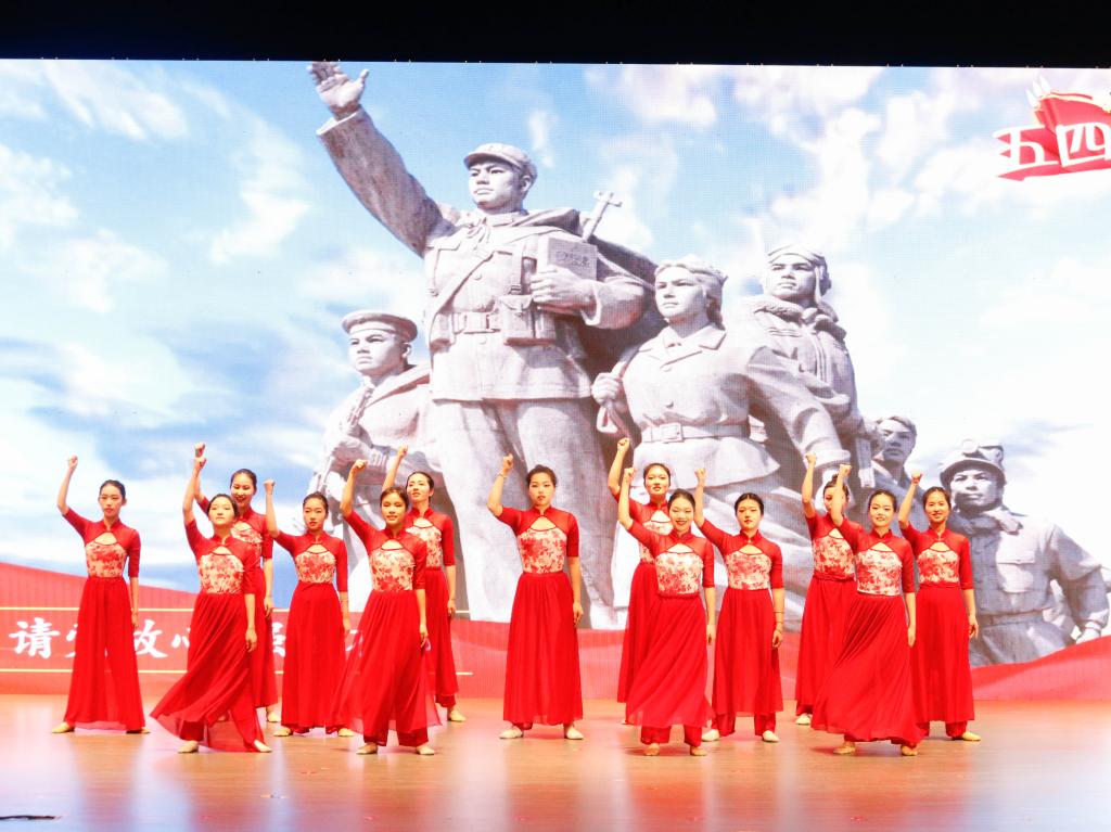 “临风飘荡,穿越时空,回到写满芳华的纸页上。还记得吗?1919年,“还我青岛!”—一句声嘶力竭的呐喊!.....”集体诗朗诵《永远的风华正茂》拉开了大会的序幕,以奋斗姿态激扬青春,将“五四精神”薪火相传。