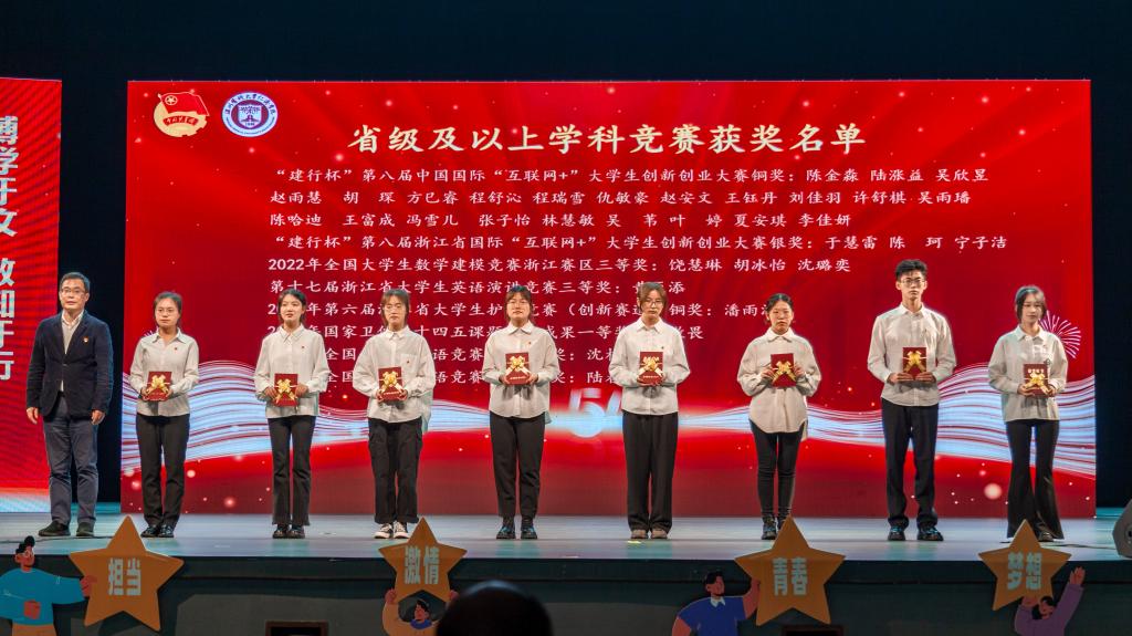 本次表彰大会由“仁心如初,文明向善”“济世旅途,戮力同心”“博学于文,致知于行”“致用于世,守正创新”四个篇章构成,分别对获得优秀志愿者、全国百强暑期社会实践团及实践项目、暑期社会实践优秀指导老师及实践活动先进个人,2022年先进班团集体、新生班级优学奖、班级畅学全优奖、新生寝室优学奖,优秀团干部、优秀团员、浙江省政府奖学金、国家奖学金和国家励志奖学金等荣誉的325个先进个人和51个先进集体,以及55个省级及以上文体类竞赛、83个省级及以上学科竞赛等奖项的获得者进行了表彰奖励。