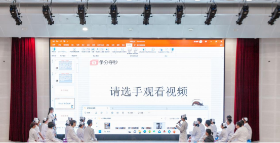 本次大赛共分为初赛、决赛、宣誓三个部分。初赛考核学生的基本护理礼仪常识,以笔试成绩筛选出十二组选手。决赛内容分为视频纠错和情景剧表演两个部分。在视频纠错环节,设定了仪容、仪表、站姿、行走、坐姿以及拾物、端治疗盘、推治疗车、推轮椅等基本护理礼仪规范,选手们凭借扎实的专业知识和充分的准备表现出色,精彩抢答赢得阵阵掌声。在情景剧表演环节,选手们思维敏捷、见招拆招,用优雅的姿态、规范的技术操作、温馨的语言自编自导自演,展示了患者入院护理礼仪、老年护理礼仪、护士查房护理礼仪、护士工作环境中接听电话礼仪等情景,传达出敬佑生命、甘于奉献的职业精神,每一组出场都精彩纷呈,现场掌声不断。