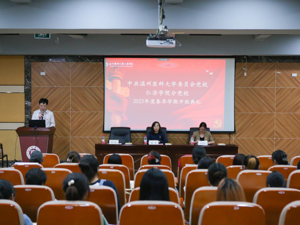 4月20日,温州医科大学党校仁济学院分党校2023年春季学期开班典礼在茶山校区求新楼报告厅举行,滨海校区仁心厅同步直播,学院党委书记、分党校校长陈乃车、党委副书记、党校副校长刘洁、姜旭英出席,本期党校全体学员参加,典礼由学院学生工作办公室主任季子正主持。