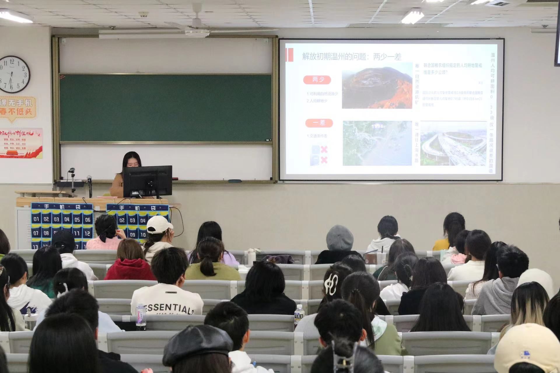2023年11月22日晚六点三十分,党建服务与人才培训中心在滨海校区开展了以“物质文明和精神文明相协调现代化的温州实践”为主题的一周看时事活动。主讲人从“温州的物质文明发展倾向”、“温州的物质文明发展过程”、“新时代温州争做社会主义现代化先行市”、“温州的物质文明与精神文明的关系 ”四个角度进行讲述。