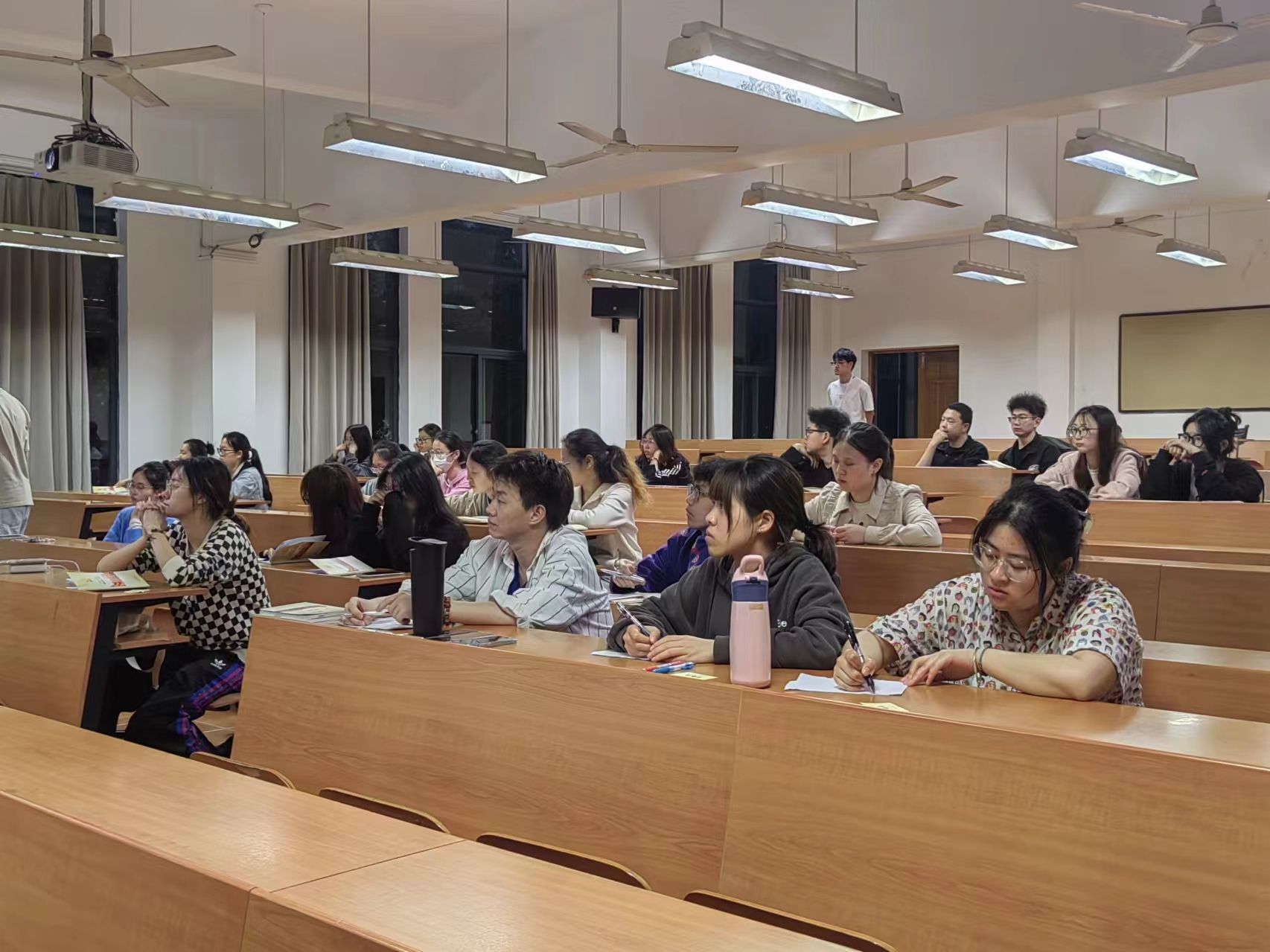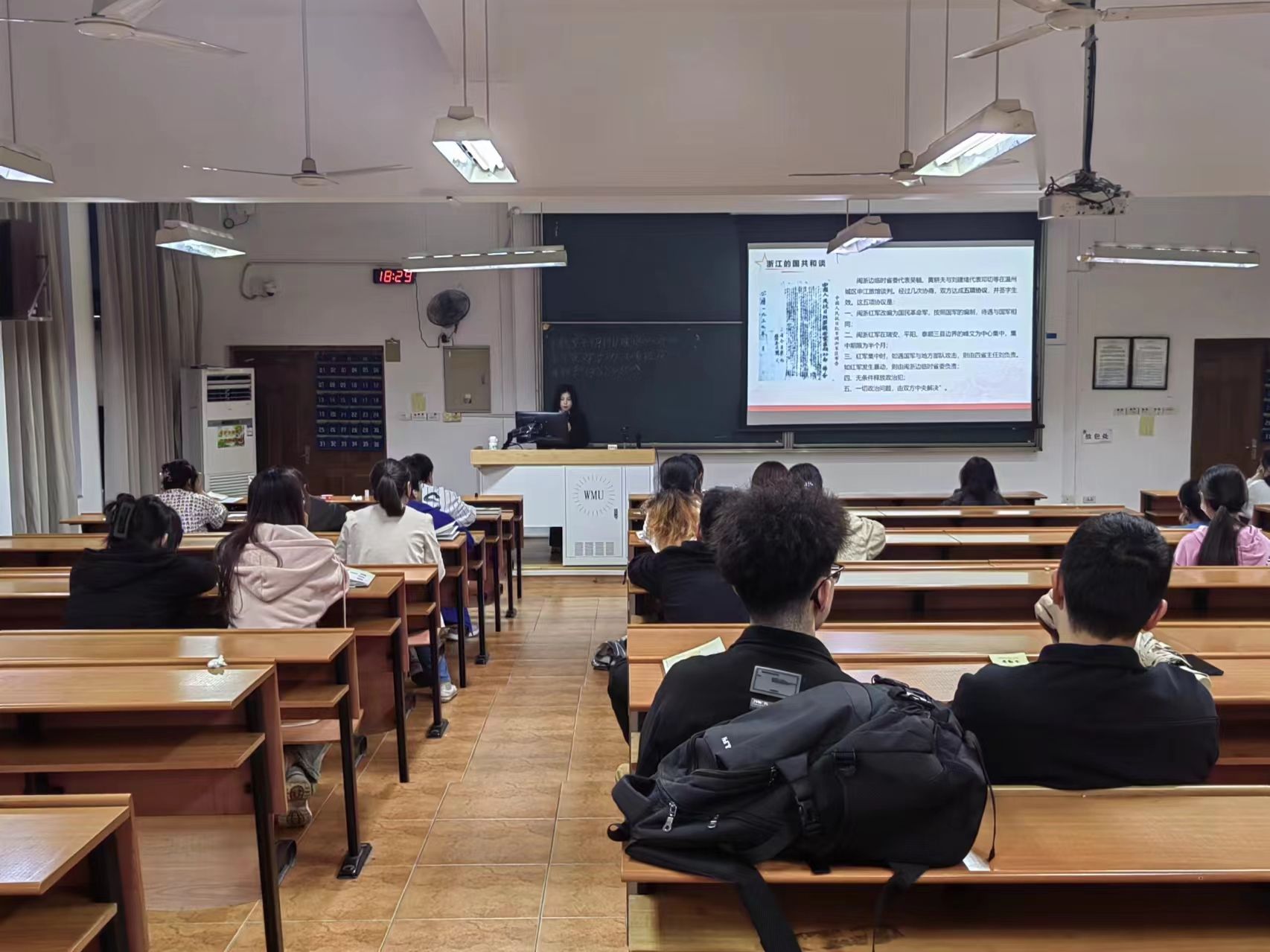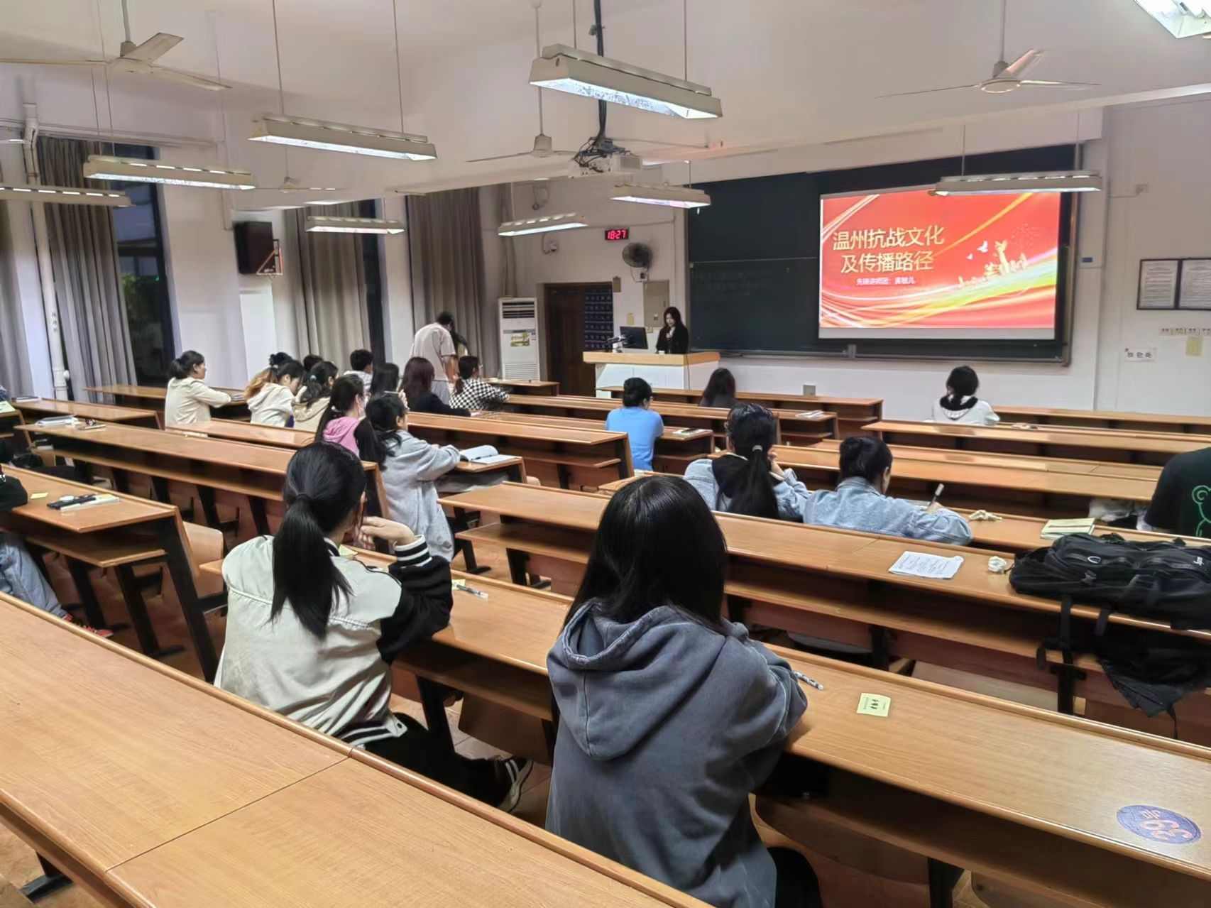 2024年4月19日晚6点30,党建服务与人才培训中心在茶山校区开展了主题为“温州抗战文化及传播路径”的高峰论坛活动。主讲人黄敏儿从“从北平到浙南”、 “从歌咏到书刊”、 “从旧日看今朝”三个部分进行讲述。