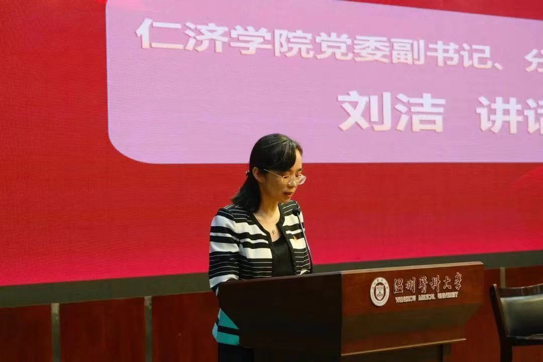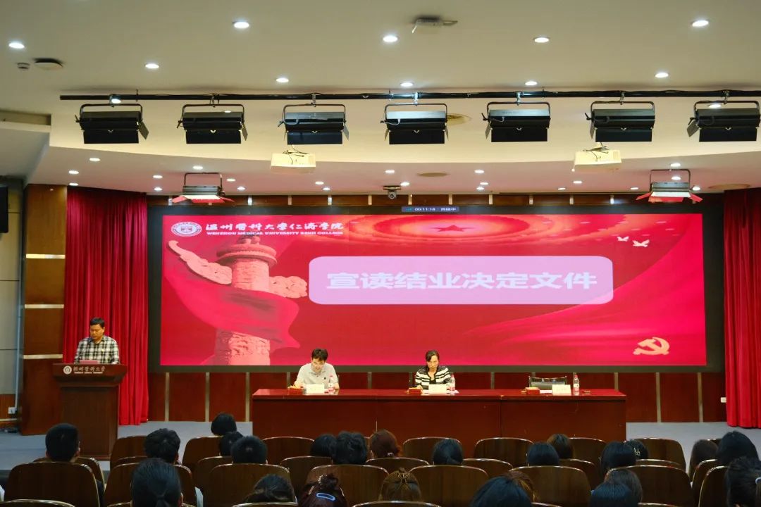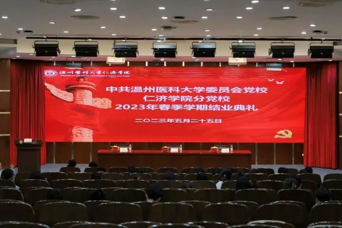 5月25日,中共温州医科大学委员会党校仁济学院分党校2023年春季学期结业典礼在茶山校区旭光厅举行,滨海校区1401教室同步直播,仁济学院党委副书记、分党校副校长刘洁,仁济学院党委委员、办公室主任张树辉出席,本期培训班六百多名学员参与,典礼由学院学生工作办公室主任季子正主持。