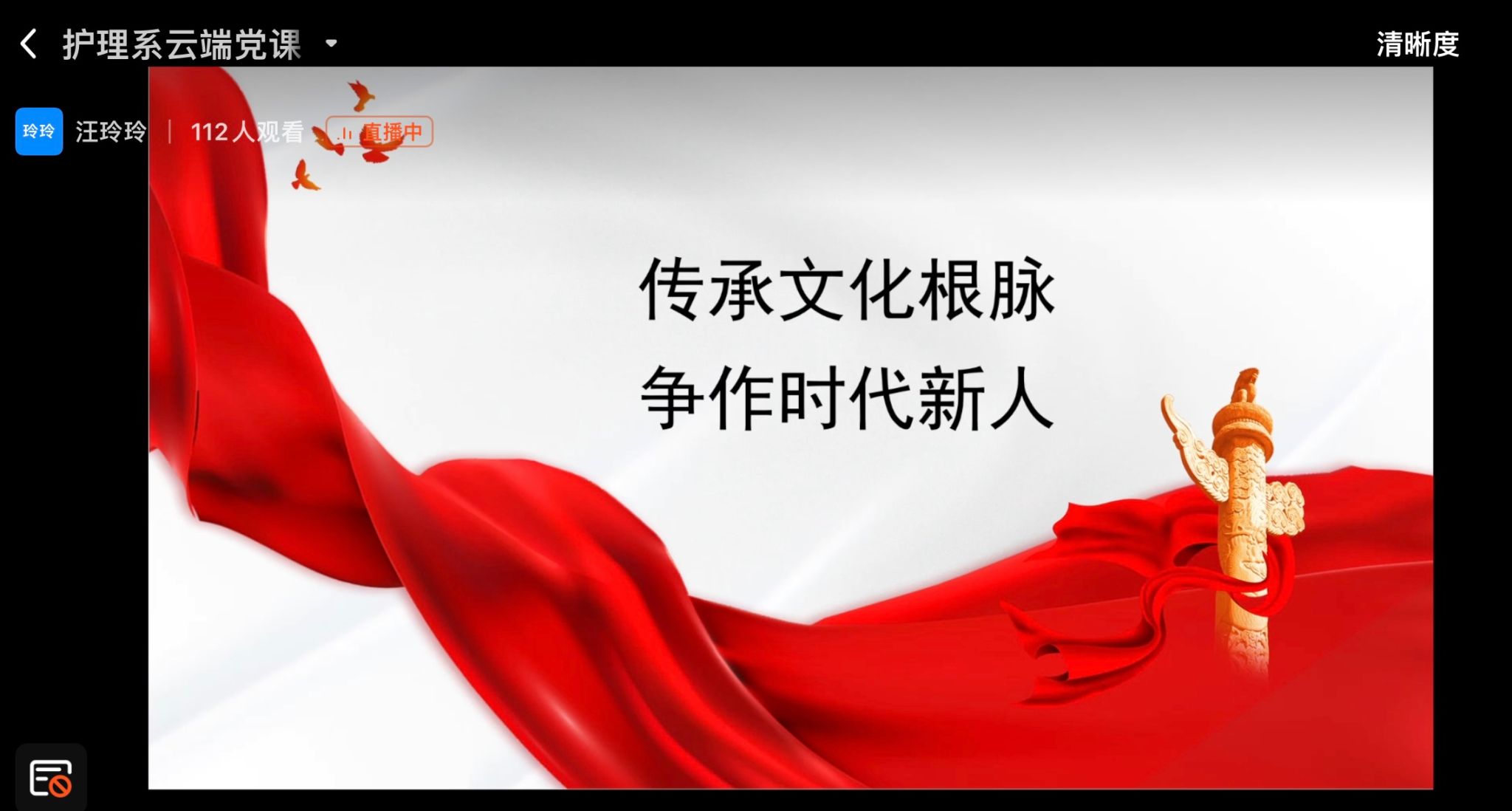 为深刻学习习近平文化思想,护理系第二党支部和护理系第三党支部于2023年12月13日晚上以钉钉直播的方式开展了云端党课,本次党课由护理系党总支书记、护理系第二党支部书记汪玲玲老师主讲。