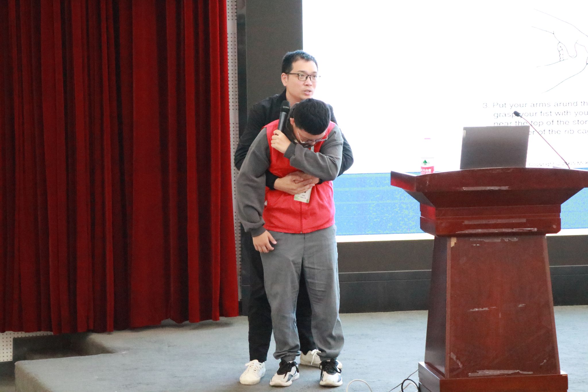 活动伊始,潘医生向新生介绍了心肺复苏术(CPR)的重要性、操作步骤及其要点,通过实际操作,为新生进行进一步的演示及讲解,展示了常见的错误按压法。面对心脏骤停的患者,自动体外除颤器(AED)是最为重要的急救工具,潘医生详细讲解了AED的使用方法和注意事项,让同学们在面对紧急情况时能够迅速而准确地使用这一关键设备。除了心肺复苏术和 AED的使用,海姆立克急救法是另一个日常必学的急救技能。潘医生用实际案例,向同学们展示了海姆立克急救法在处理气道异物梗阻时发挥的重要作用,让同学们对这一急救技能有了更深的了解。