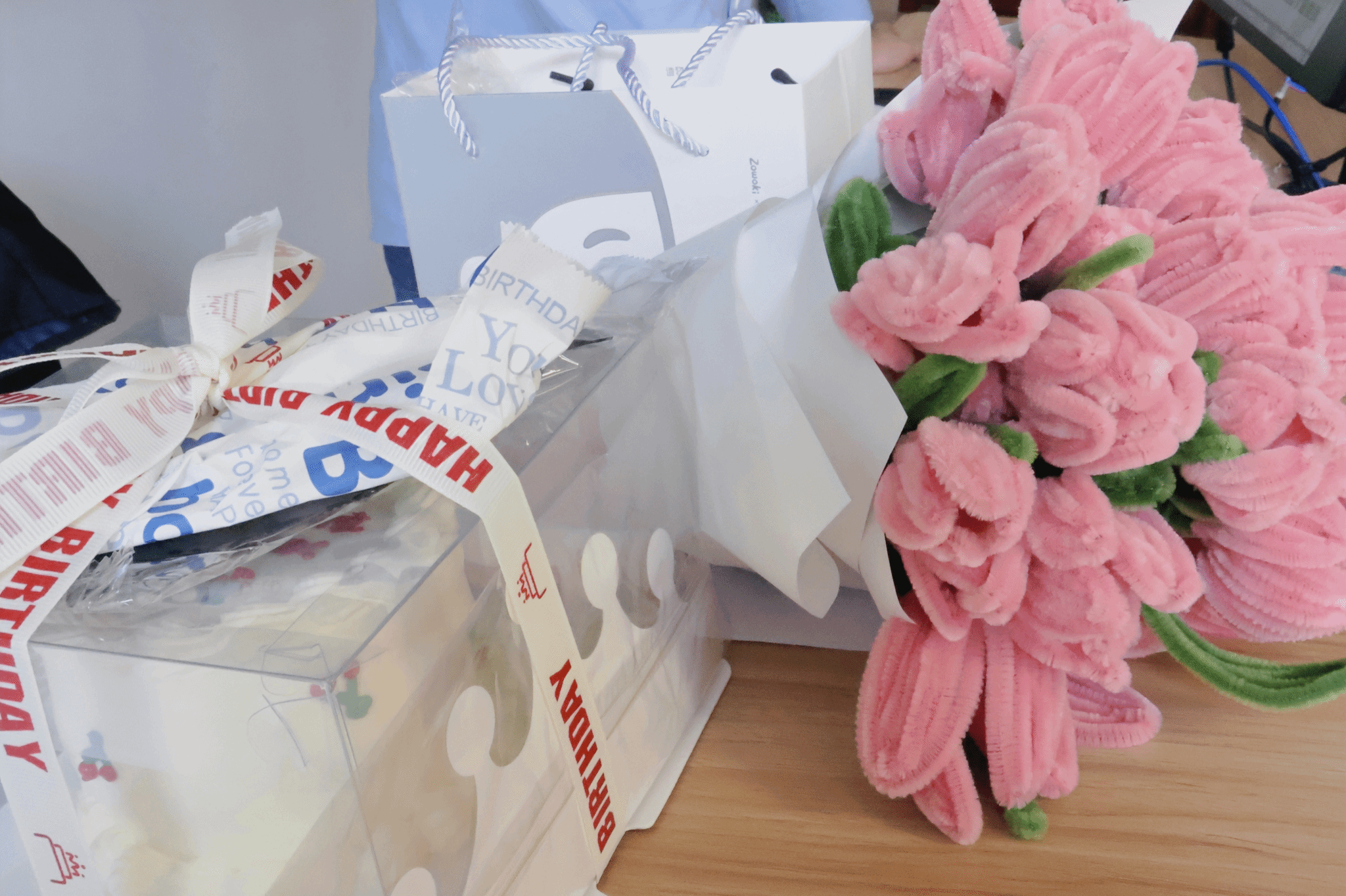 康复一班、二班的同学们利用课余时间一起学习了扭扭棒的制作方法,每个人制作了一支郁金香。4月26日早上十点,恰是新雨初晴之时,当张老师如常提前来到教室前准备上课时,两班的代表小跑着送上了一束同学们手工制作的郁金香和生日蛋糕。教室内的黑板提前画上了生日祝福板报,同学们齐声高呼:“老师,生日快乐!”。虽然这是一个简单的仪式,但是也让张老师感受到了来自同学们的心意。
