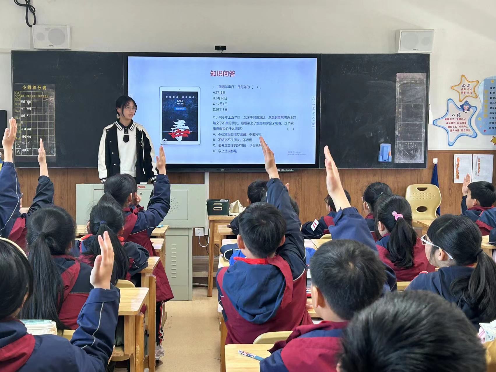 23护理6班团支部在洞头实验小学开展了禁毒宣讲活动,他们的努力为学生们营造了一个安全、文明、和谐的学习环境,构筑了一道坚固的防线,以保护孩子们免受毒品的侵害。