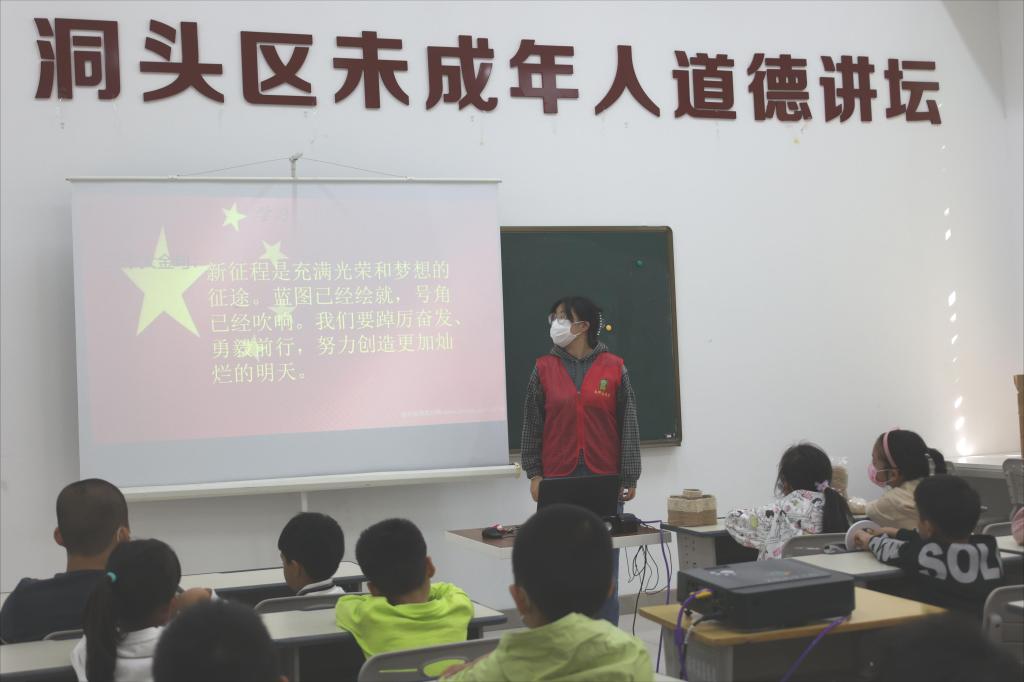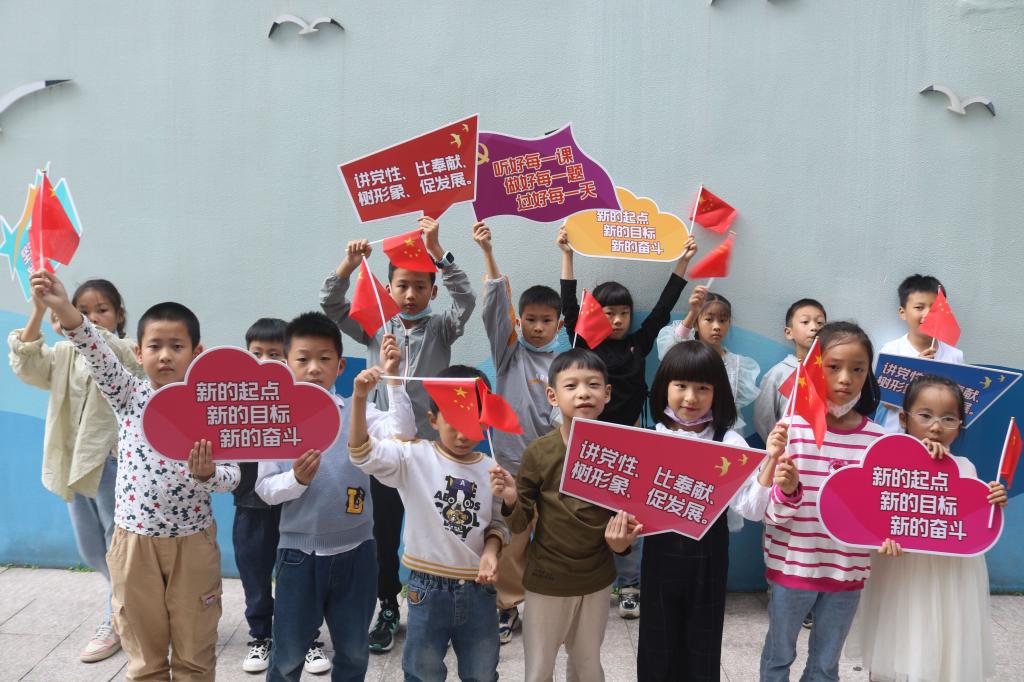 随后,志愿者与小朋友们一起朗读党的二十大的金句:新征程是充满光荣和梦想的征途。蓝图已经绘就,号角已经吹响。我们要踔厉奋发、勇毅前行,努力创造更加灿烂的明天!小朋友们情绪饱满,仿佛已将自己的雄心壮志融入进朗读声里。紧接着,志愿者以“自己能够为祖国做的事”向小朋友们发出提问,小朋友们纷纷举手,畅所欲言:“我可以为祖国捡干净地上的垃圾”,我能把五星红旗画的更鲜艳”等等。从小朋友们的发言中我们感受到了一颗颗赤诚的爱国之心。