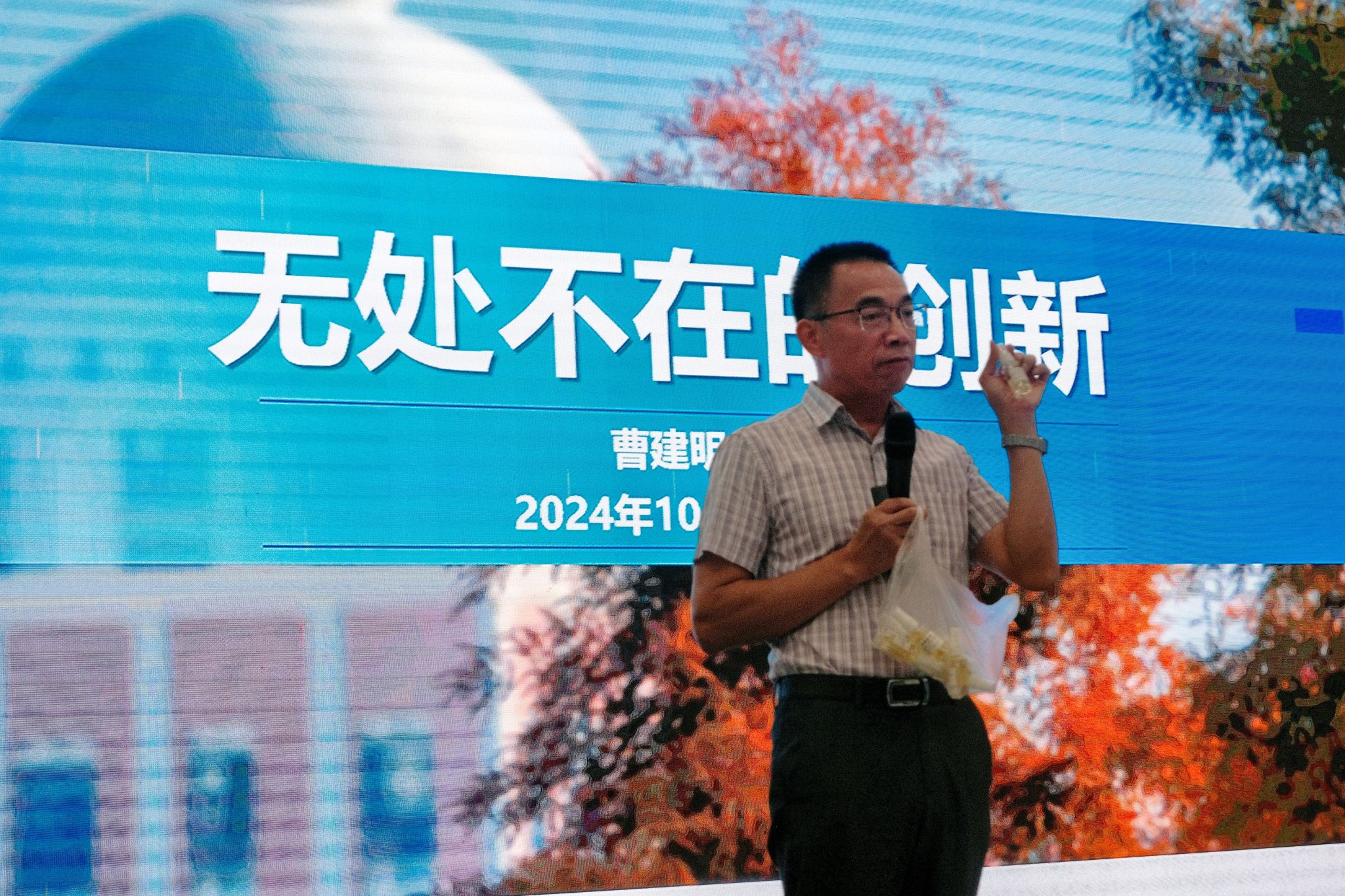 曹建明教授带来主题为《无处不在的创新》的精彩讲座将活动推向了高潮。曹教授以其深厚的学术背景和丰富的创新创业实践经验,巧妙融合理论与实际,引领学生们探索创新世界。他通过干眼喷雾器、心肺复苏训练器及抑霉制剂等创新产品,生动展示了科技创新无处不在、科技创新如何解决日常问题、提升医疗培训效率。曹建明强调,创新并非高不可攀,而是源于生活细微之处,鼓励同学们发扬温医大敢为人先的创新精神,要准确识变、主动求变、科学应变。