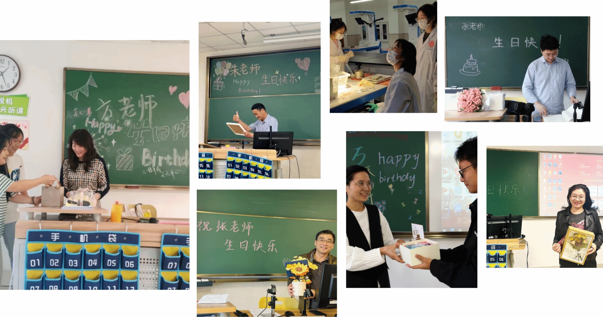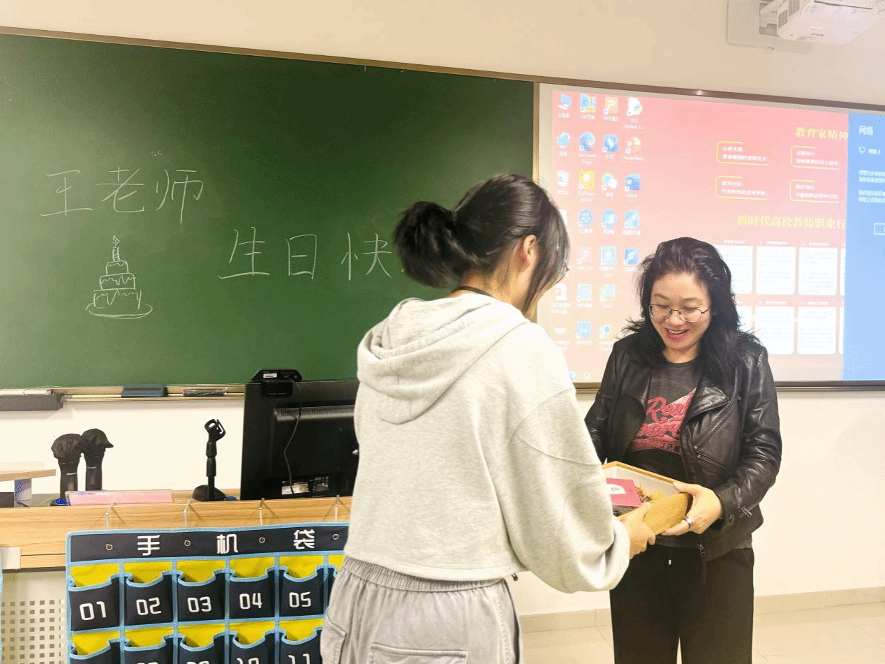 上课前,同学们提前到达教室,细心布置,在黑板上写着“王老师,生日快乐”,简洁而深情的祝福语凝聚了全班的敬意和祝福。当王老师步入教室,同学们齐声祝她“生日快乐”。随后,学生代表送上了精心准备的礼物:一本装满回忆的干花相册和两张手写贺卡,表达了对王老师的深情厚谊。王老师眼中闪烁着惊喜,脸上洋溢着幸福的笑容,温暖而灿烂。