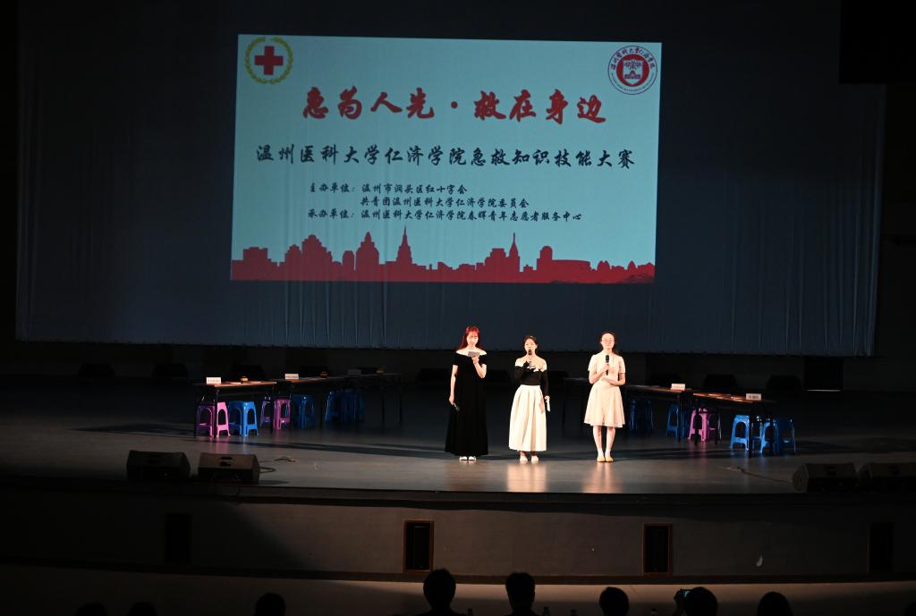 决赛主要分为“急救知识竞赛”与“急救小剧场演绎”两大进程。第一进程中,每队成员两两上场,在15秒内细致浏览过急救知识的题目后,按照主持人指令统一举牌展示所选答案。“中国红十字会的宗旨是什么?”“应急救护的目的是什么?”“地震时,怎么逃生?”应急救护知识竞赛环节,各组参赛队员面对问题沉着应答,积极抢答,通过专业知识问答,普及了应急救护专业知识,更是调动参赛选手提升专业素养的积极性。全部答题过程都有裁判在旁实时记录分数,确保大赛公正性。