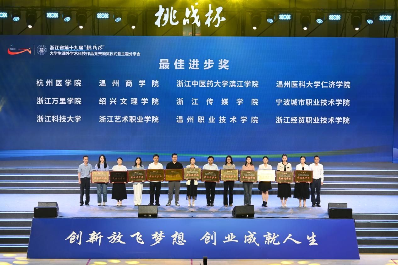 5月18日,由共青团浙江省委、浙江省教育厅、浙江省社会科学院、浙江省科学技术协会、浙江省学生联合会主办,浙江中医药大学承办的浙江省第十九届“挑战杯”大学生课外学术科技作品竞赛颁奖典礼在浙江中医药大学举行。我院荣获金奖1项、银奖5项、铜奖8项,学院连续两年荣获“最佳进步奖”。