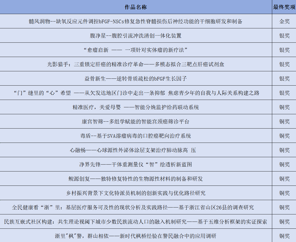 本届比赛分为自然科学类学术论文、哲学社会科学类调查报告、科技发明制作三类作品组别,共有2057件作品进入省级复赛,71所高校的412件作品入围省级决赛。经过激烈角逐,我院“髓风润物--缺氧反应元件调控bFGF-NSCs修复急性脊髓损伤后神经功能的干细胞研发和制备”项目获金奖,“腹净星--腹腔引流冲洗清创一体化装置”、“愈瘤启新 —— 一项针对实体瘤的新疗法”等五项获银奖,“精准医疗,关爱母婴 ——智能分娩监护给药联动系统”、“康宫智筛--多组学赋能的智能宫颈癌筛诊平台”等八项获铜奖。