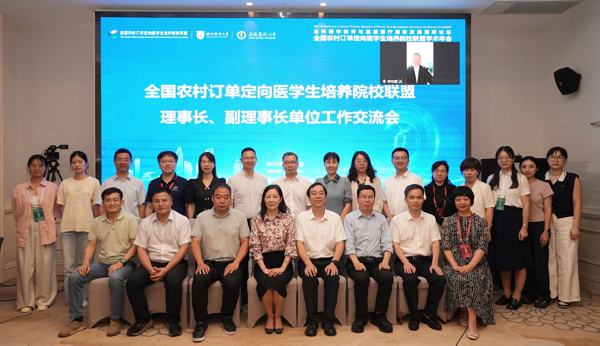 2025 年 8 月 25 日,全国农村订单定向医学生培养院校联盟 2025 年理事长、副理事长单位工作交流会在安徽省合肥市召开。本次会议共有14 所联盟理事长、副理事长单位的代表参会,共商联盟合作与交流发展方向、高质量医学教育发展。中国工程院院士、联盟理事长、温州医科大学校长李校堃参会致辞。会议由联盟理事长单位温州医科大学副校长朱雪波主持。