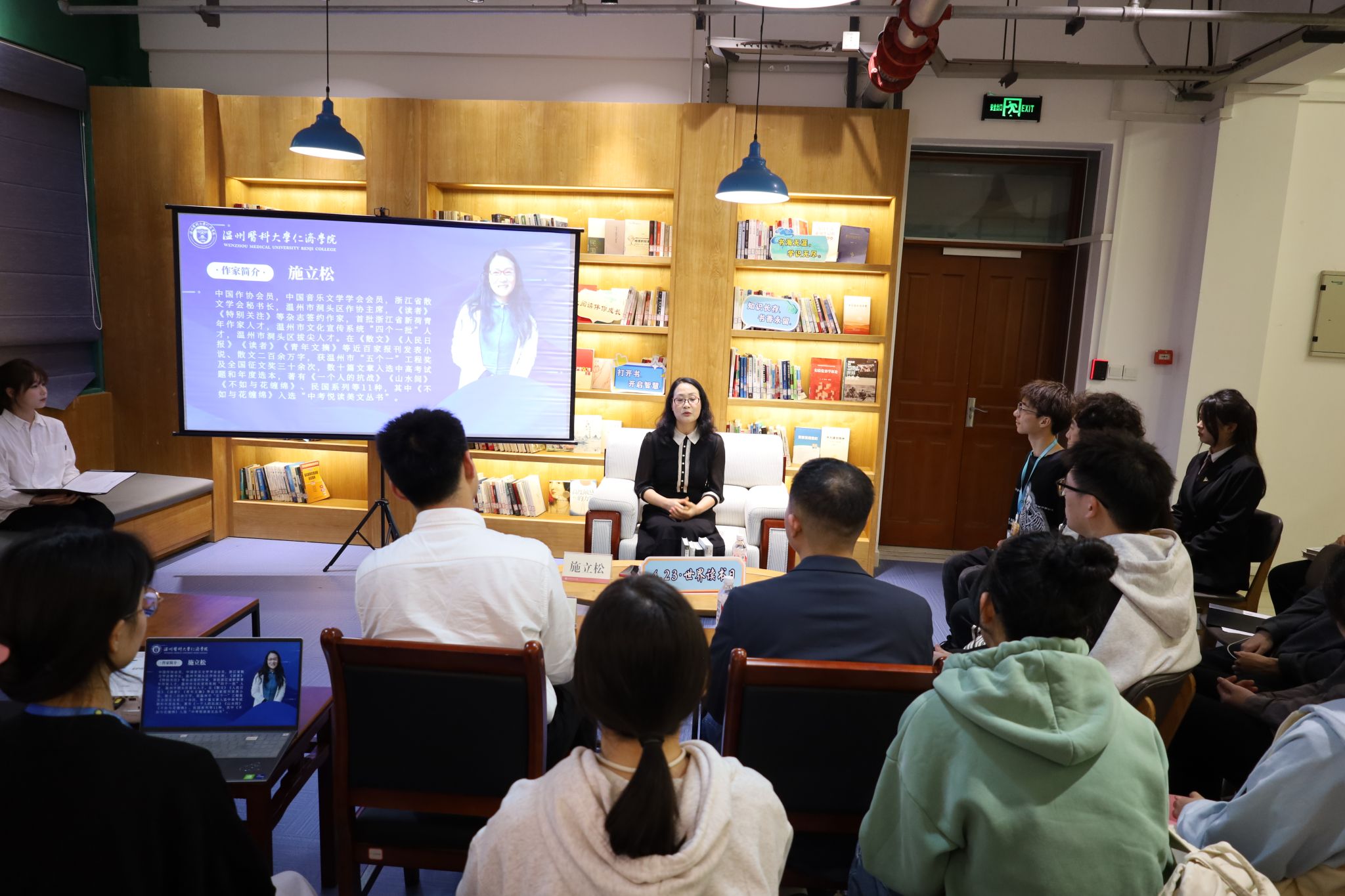 活动中,施立松老师以其独特的视角和感人的经历,深情讲述了她从医学领域跨界到文学的转变之路,并分享了阅读如何深刻影响她的人生轨迹。她坦言:“尽管我的职业生涯始于医学,但是阅读引领我步入了文学的殿堂。在温州医学院的学习生涯和医院工作中,我始终珍视阅读时光,是那些书籍为我打开了新世界的大门,让我领略到了医学之外的广阔天地。”施老师还回忆了她在洞头海边,伴随着海浪声沉浸于书海的时光,分享了她如何从中汲取力量,找到内心的宁静与成长的动力。她鼓励在场的每一位同学,不论未来走向何方,都不应忘记阅读的力量和它所带来的深远影响。